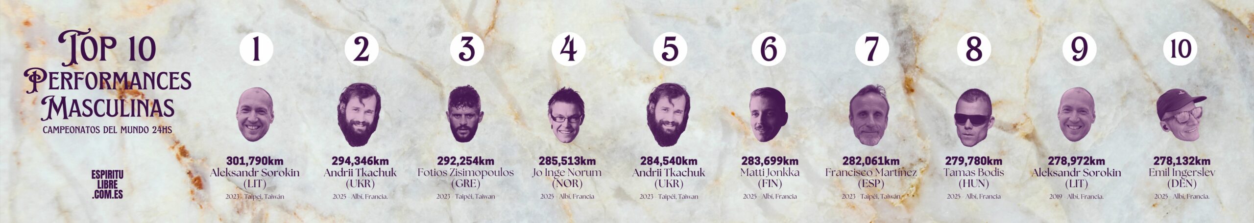 Andrii Tkachuk es el nuevo campeón del mundo de 24hs, sumando su segundo podio consecutivo y la segunda mejor marca histórica de estos campeonatos con 294.346km. La medalla de plata fue para el atleta noruego Jo Inge Norum con 285.513km, logrando un hito histórico como el primer atleta de ese país en subirse a un podio en estos campeonatos. Jo Inge tiene una larga trayectoria como ultrafondista de pista&carretera quien compite desde el 2017 y ha participado en los últimos tres campeonatos del mundo de 24hs representado a su país. Podríamos decir lo mismo del nuevo ganador de la medalla de bronce, Matti Jonkka de Finlandia, quien logró la primera medalla histórica para su país con una marca de 283.699km. El joven finlandés, con menos de treinta años y solamente dos registro en 24hs (211km del 2020 y 223km del 2023), tuvo su debut soñado en estos campeonatos realizando un performance impecable.