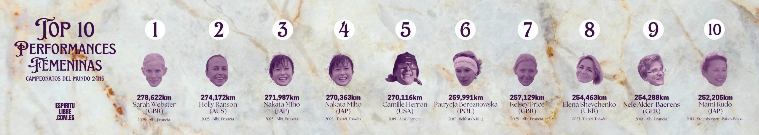 Sarah Webster se presentaba en la línea de partida con el récord británico femenino de 100km bajo el brazo, además de ser la actual medalla de bronce mundial de 100km. Sumamos a estos dos hitos la medalla de oro de los campeonatos del mundo de 24hs y el récord mundial femenino que ha logrado Sarah en estos WC-24hs con un registro de 278.622km superando el anterior récord de 270.363km (Miho Nakata, JAP en WC-24hs del 2023) Recordamos que desde el año 2012 que no veíamos a una atleta británica subirse a un podio de un campeonato del mundo y esa atleta no fue otra que Emily Gelder con una medalla de bronce. El segundo escalón del podio femenino fue para la atleta australiana Holly Ranson con 274.172km quien debutaba en estos campeonatos del mundo de 24hs y logrando la primera medalla de la historia para su país. Pasamos a la medalla de bronce que fue ganada por quien inicio este WC-24hs siendo la campeona defensora, estamos hablando de la nipona Miho Nakata quien paró el crono en 271.987km.