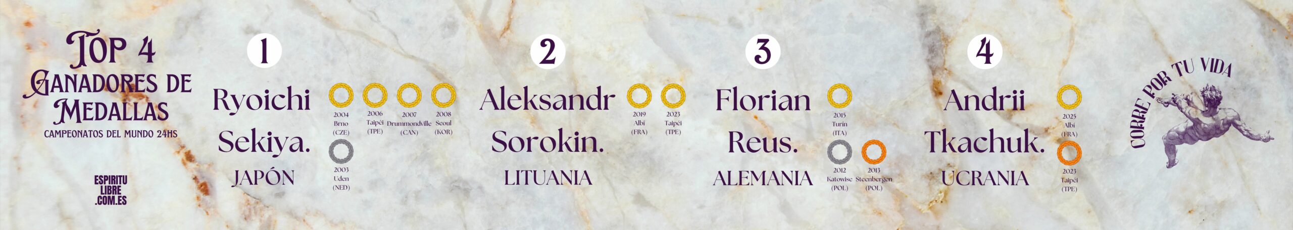 Con 273.366km, el japonés Ryoichi Sekiya se cuelga su tercer oro consecutivo y cuarto en total en estos campeonatos del mundo de 24hs. En féminas, Francia consigue por primera y única vez en la historia de estos campeonatos las tres medallas de la clasificación!
