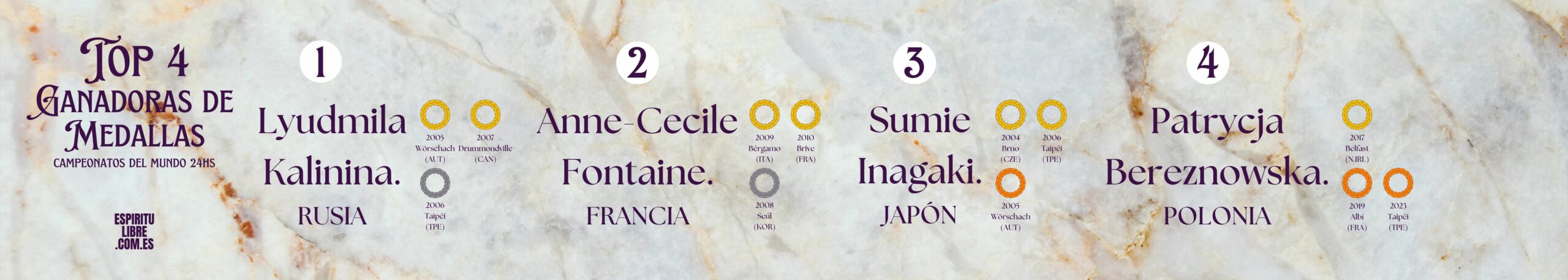 Dentro de los equipos femeninos y remontándonos a los principios de la historia las rusas, japonesas y francesas solían dominar estos podios por equipos. Pasados los años las norteamericanas tomaron la posta como las invencibles sin embargo su racha (después de cinco oros consecutivos) se cortó a manos de las polacas que llevaban dos campeonatos consecutivos siendo plata y por fin, en el pasado WC-24hs subieron a lo más alto.