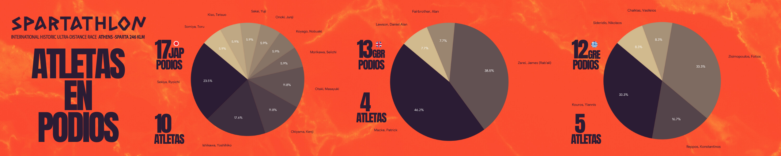 Dejamos para el final una grafica en donde te contamos la distribución de los podios (primero, segundo y tercero) en los dieciséis primeros países del ranking. A simple vista vemos, claramente, los diez primeros puestos de los griegos de la mano de Kouros, Reppos y Zisimopoulos. Por supuesto que la cantidad de podios de Japón, Gran Bretaña y Alemania resalta sobre el resto de países y eso es algo que se ve claramente. Países Bajos, Eslovenia y Dinamarca son los únicos países del grafico sin victorias. Por ultimo mencionamos las tres victorias consecutivas de la USA con Scott Jurek y los tres podios de Brasil (primero, segundo y tercero) de la mano del magnífico Valmir Nunes.