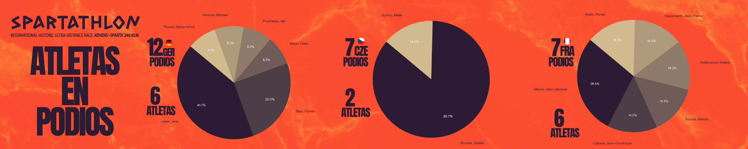 En nuestro segundo gráfico te mostraremos cuantos atletas de un mismo país se han necesitado para sumar el total de podios mencionados en nuestra anterior grafica. Aquí hemos colocado solamente a los seis primeros países comenzando por Japón que necesito de diez atletas para sumar sus diecisiete podios. Los británicos, por su parte, han necesitado de cuatro de los suyos para sumar sus trece podios, teniendo en cuenta que la dupla Macke/Zarei tienen en su poder seis y cinco podios respectivamente. Lo mismo sucede con los alemanes Lukas/Reus quienes suman ocho podios entre ellos y los griegos Kouros/Zisimopoulos. Destacamos enormemente al checo Brunner ha logrado seis de los seis podios de Republica Checa. Por último y aunque no hayamos podido colocarlos en la grafica, mencionamos al austriaco Markus Thalmann quien ha conseguido todos los podios para su país, lo mismo con el Sueco Rune Larsson y sus cinco podios, Mravlje con sus cuatro para Eslovenia, los atletas Jurek y Nunes con sus tres podios para la USA y Brasil, al igual que el portugués Joao Oliveira con sus dos podios.