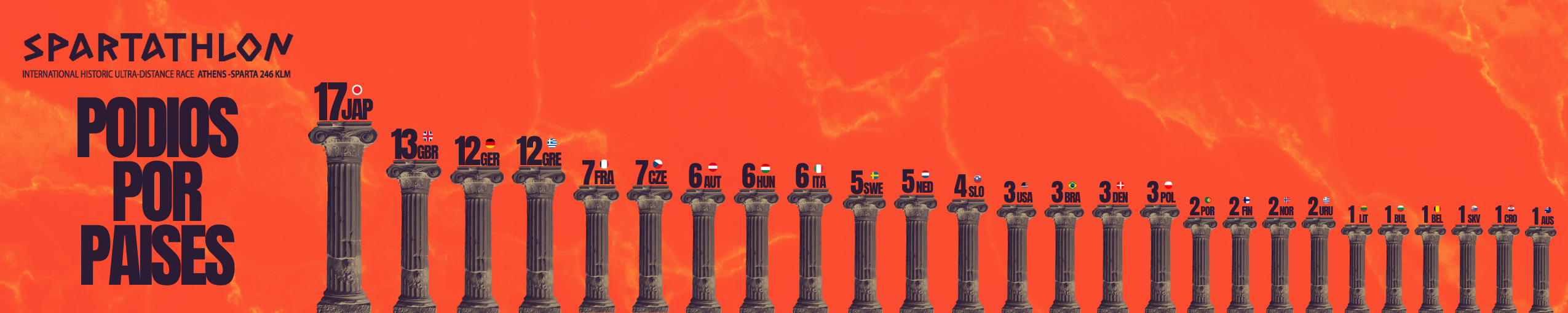 En esta sección del artículo te mostraremos los podios masculinos del Spartathlon por países y comenzamos por una mirada general en donde encontramos, sorpresa para nadie, a Japón en lo más alto del ranking. Los nipones suman diecisiete podios en toda la historia del Spartathlon y están a cuatro de distancia de los británicos. Un puesto más abajo del reino unido encontramos a los Alemanes y Griegos con doce podios. Estos cuatro países son los que más podios han sumado, con diferencia, en toda la historia de esta carrera. Recordamos que la última vez que vimos a griegos o japoneses en el podio fue en la edición del 2024 y 2024, mientras que alemanes y británicos no han vuelto a subir a un podio desde el año 2015.