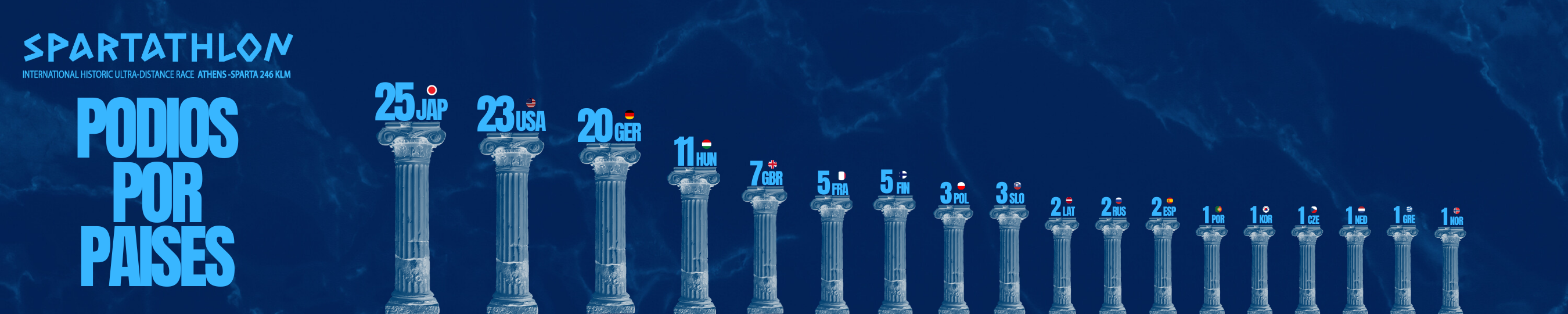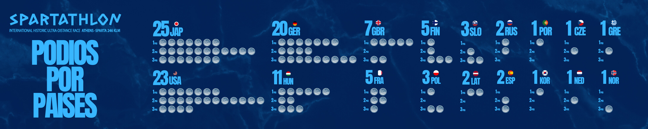 Dejamos para el final una gráfica en donde te contamos la distribución de los podios (primero, segundo y tercero) de los países del ranking. Vemos que los tres primeros países están empatados en cuanto a victorias se refiere, con siete cada uno. Algo que nos ha llamado la atención es que más de la mitad de todos los podios de las atletas húngaras han sido victorias. También vale destacar que las británicas han subido cinco veces a lo más alto y representando un 70% del total de podios logrados en el Spartathlon. Las francesas tienen dos victorias, dos segundos puestos y un tercero, mientras que las finlandesas poseen una victoria, un segundo puesto y tres terceros. Destacamos por último, dentro de los países restantes del ranking, las dos victorias de Letonia.