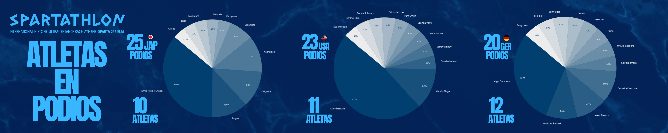 En esta sección del artículo te mostraremos los podios femeninos del Spartathlon por países y comenzamos por una mirada general en donde encontramos, sorpresa para nadie, a Japón en lo más alto del ranking. Las niponas suman veinticinco podios en toda la historia del Spartathlon y están a dos de distancia de las norteamericanas. Si sumamos los podios de estas grandes dos potencias obtendremos un 44% del total de podios históricos, impresionante. En el tercer puesto encontramos a las Alemanas con veinte podios en la historia del Spartathlon y si volvemos a realizar el mismo ejercicio sumando a Japón, USA y Alemania obtendremos aproximadamente el 63% del total de podios. En el cuarto puesto y con once podios aparecen las húngaras y con siete las británicas.